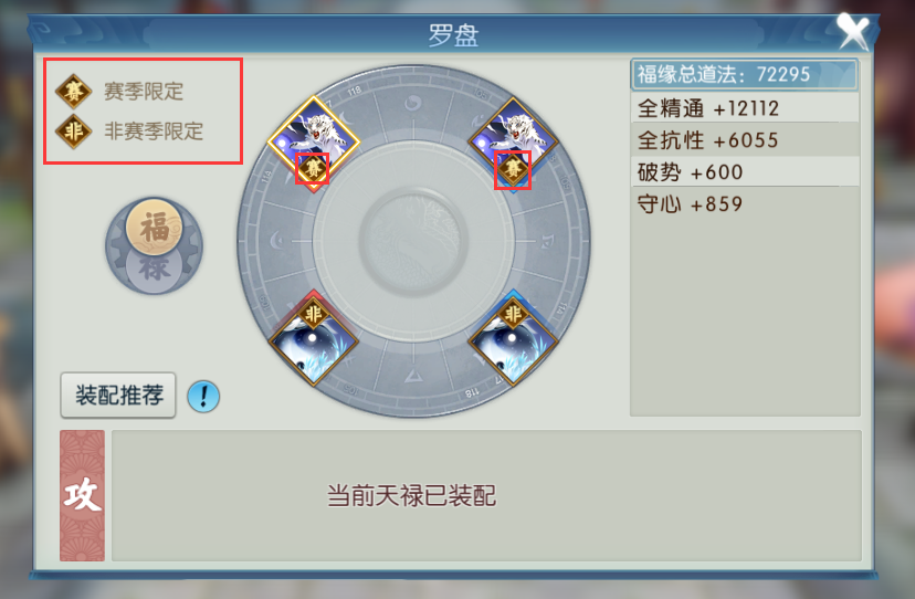 福缘罗盘最多放置4个天禄。其中上方赛季限定仅能放置当前赛季的天禄。当切换赛季时,放置在此位置的旧赛季天禄福缘属性将生效。 非限定赛季可以放置非当前赛季的任意天禄。