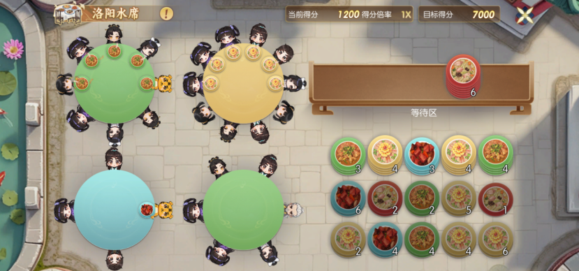 进入活动场景后,仙友通过将菜品按照颜色和数量将菜品分发至对应的桌子进行消除,每消除一张桌子获得的积分不同,通过完成更多桌水席,获得更多分数,单局达到一定分数后可领取一次副本奖励,获得获胜奖励的对局结算的得分将会累计,总得分可以解锁进度奖励,根据历史最高得分进行本服和全服的排名,得分相等的玩家会根据达成用时进行排序。活动结束后会为表现优异的玩家发放丰厚奖励。